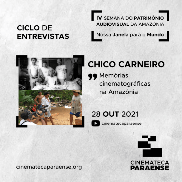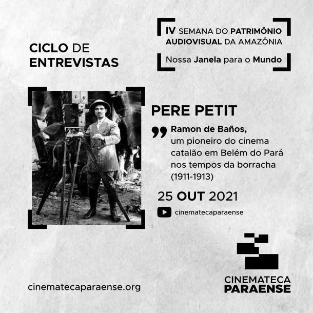 A Semana da do Patrimônio Audiovisual da Amazônia surgiu como iniciativa do projeto Cinemateca Paraense para difundir e discutir com a sociedade as práticas e experiências em preservação, conservação e comunicação em arquivos de filmes. Em sua quarta edição apresenta um ciclo de entrevistas mediadas pelo curador e idealizador do projeto, o professor e pesquisador Ramiro Quaresma. Serão cinco entrevistas com pesquisadores e realizadores que contribuíram para o reconhecimento da importância do cinema e do audiovisual na construção de um patrimônio de imagens e sons no Pará e na Amazônia, montando uma linha do tempo do cinema e audiovisual no estado do Pará. Entre os dias 25 e 29 de Outubro de 2021 serão publicadas no site (cinematecaparaense.org) e nas redes sociais da Cinemateca Paraense entrevistas com os pesquisadores Pere Petit, Eva Carneiro e Advaldo Castro e com os realizadores Chico Carneiro e Moisés Magalhães.