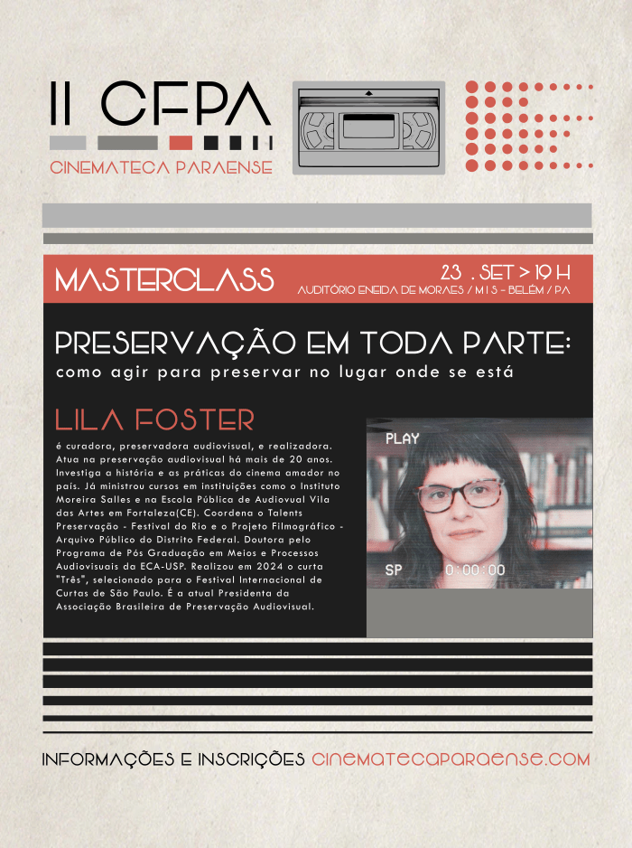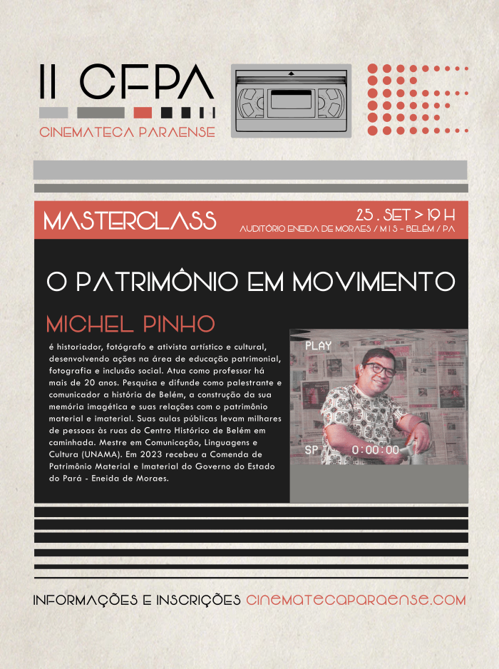Entre os dias 23 e 25 de Setembro, no Auditória Eneida de Moraes (Palacete Faciola /MIS-PA), serão realizados as Masterclasses do II CFPA – Cinemateca Paraense. As inscrições são gratuitas, limitadas à capacidade dos espaços, e podem ser feitas no site da Cinemateca Paraense (link na Bio) ou presencialmente 30 minutos antes dos eventos. São três atividades falas inéditas sobre preservação audiovisual, políticas de acervos e patrimônio para todo o público interessado no tema.