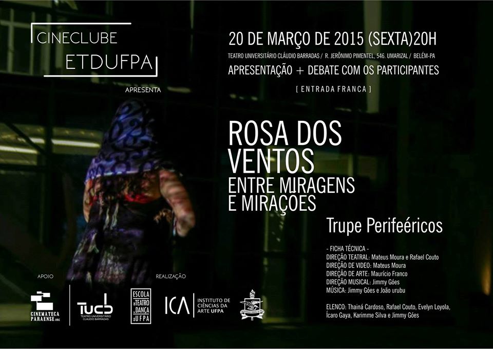 O Projeto de Extensão Cineclube ETDUFPA apresentou no dia 20 de março no Teatro Universitário Cláudio Barradas (TUCB) a peça “Rosa dos Ventos: entre miragens e mirações”. do Grupo teatral Trupe Perifeéricos, que une cinema, teatro, máscaras e entidades numa confluência poético-tecnológica que se afina com o objetivo dessa nova jornada cineclubística, que é discutir as relações do audiovisual com as artes cênicas.